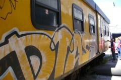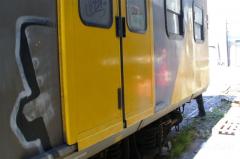 Graffiti Tags being removed from yellow and grey train coach by G.R.S